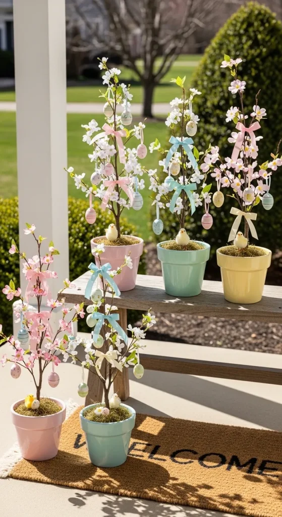 Easter trees aren’t just for indoor décor—they can thrive on your porch too. Use small potted branches or artificial twigs and decorate them with pastel eggs, ribbons, and small floral accents. A cluster of these mini Easter trees flanking your doorway can create a stunning visual impact without taking up too much space.