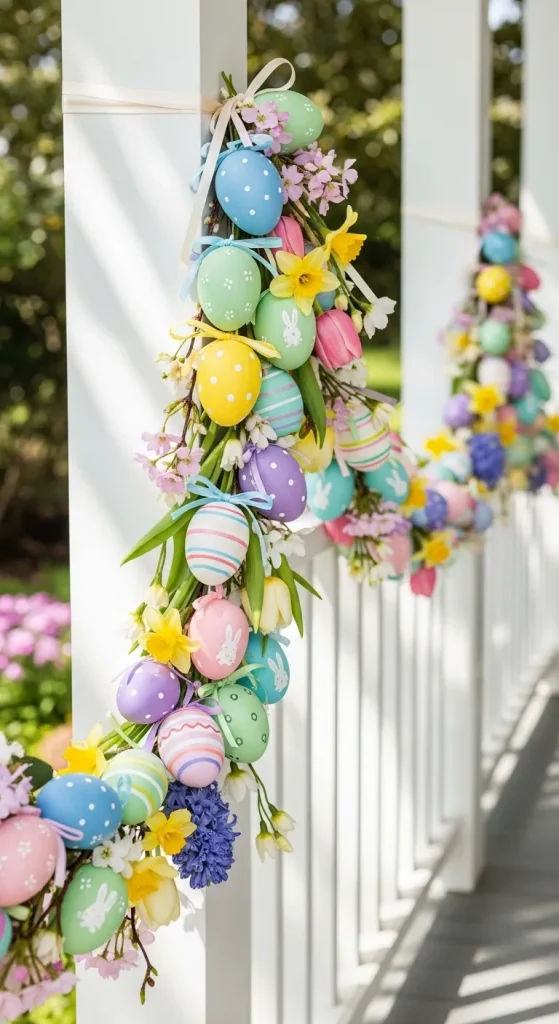 Transform your porch railing or doorway with a charming Easter egg garland. Use plastic eggs or craft your own from paper mache. String them together with twine or ribbon, alternating colors and patterns. This playful touch instantly communicates the festive spirit and can be customized to match any color scheme.