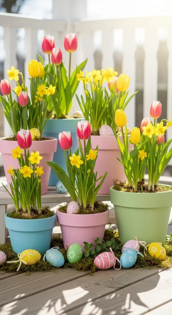 Brighten your porch with pastel-painted flower pots filled with spring blooms like tulips, daffodils, or hyacinths. Choose soft pinks, yellows, and lavenders to complement the Easter theme. Arrange pots in clusters or along the steps for a visually appealing display. Adding small decorative eggs around the base of the pots adds a subtle, festive touch.
