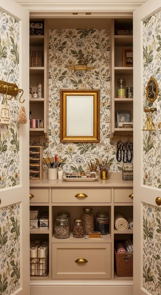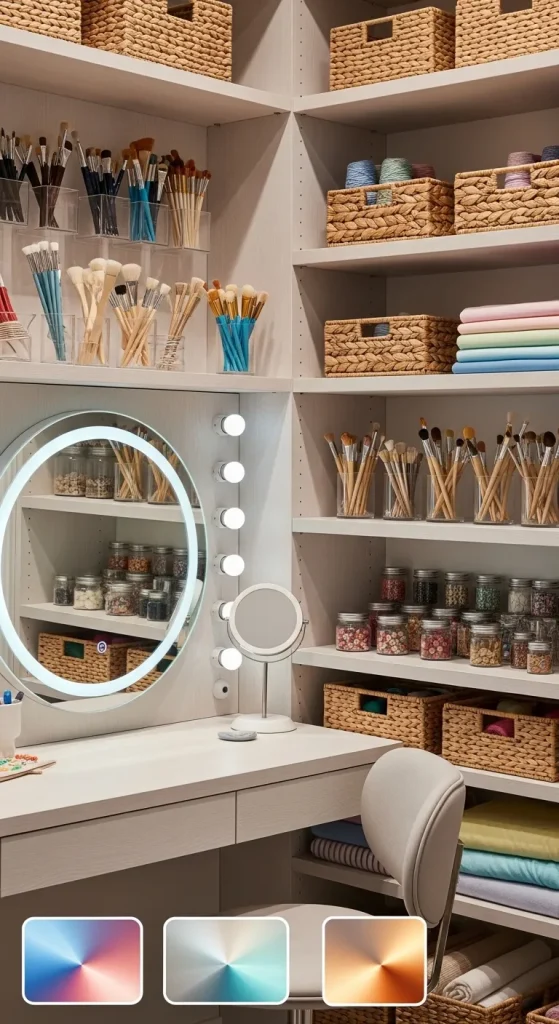 Integrate a small vanity inside your craft closet, complete with a mirror, adjustable lighting, and compartments for delicate tools like brushes, scissors, and jewelry-making supplies. This setup transforms the closet into a multifunctional luxury corner, perfect for both crafting and personal projects, offering convenience and elegance in one space.