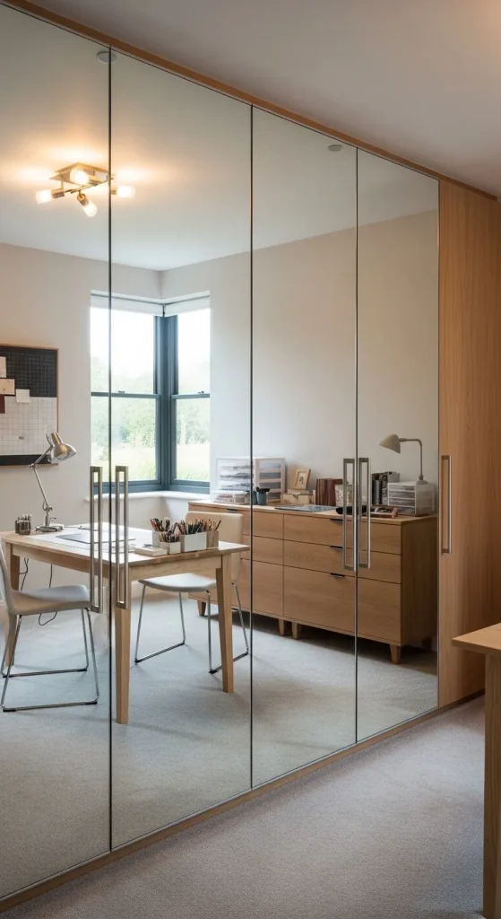 Mirrored doors add glamour while making your craft room feel larger and brighter. They reflect light beautifully, creating a spacious and inviting atmosphere. Pair mirrors with sleek metallic handles and soft-close hinges for a refined touch. Inside, maintain organized storage to enhance both visual appeal and practical function.
