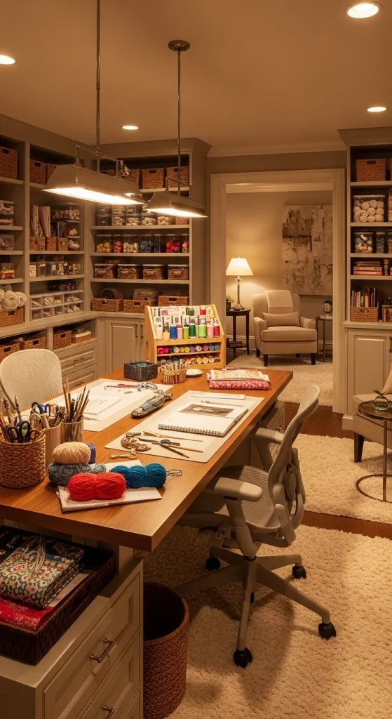 If space permits, transform your craft room closet into a walk-in sanctuary. Include ample shelving, a central work table, and even a seating area for crafting. Soft rugs, plush cushions, and sophisticated lighting complete the luxurious feel. This design makes every visit to your craft room a pleasure and an experience, rather than a simple task of grabbing supplies.