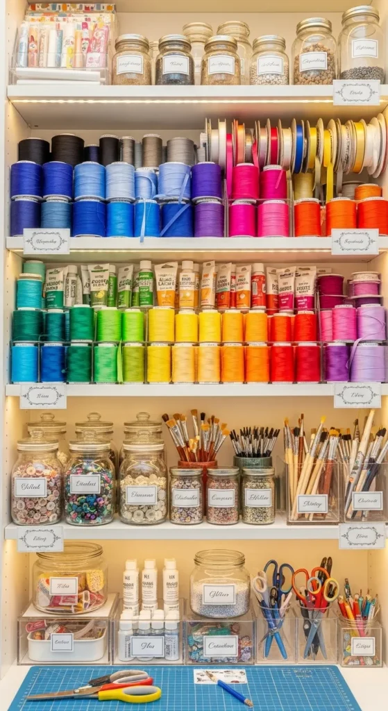 Organize your craft supplies by color to create a visually stunning closet. This method doubles as storage and decor. Arrange paints, threads, ribbons, and fabrics in gradient order for a rainbow-like display. Use uniform containers or glass jars for a polished, boutique-like finish. This approach adds both elegance and inspiration to your crafting experience.