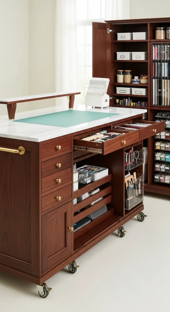 For ultimate luxury and functionality, combine your closet with a rolling craft island. This allows you to pull supplies directly from the closet to your workspace effortlessly. Include hidden storage compartments and lockable drawers within the island for high-value tools. A sleek marble or quartz countertop enhances the opulent look.