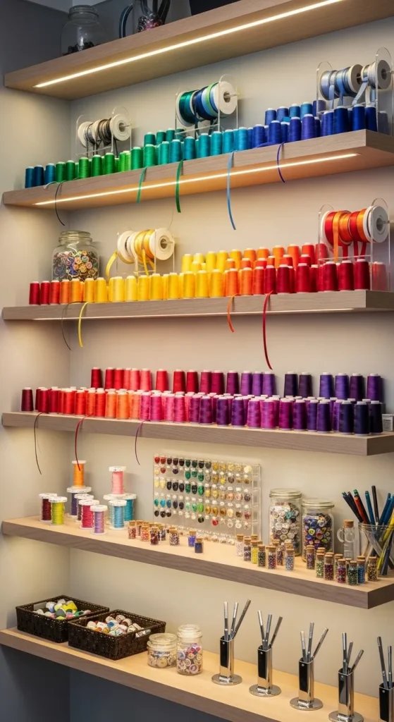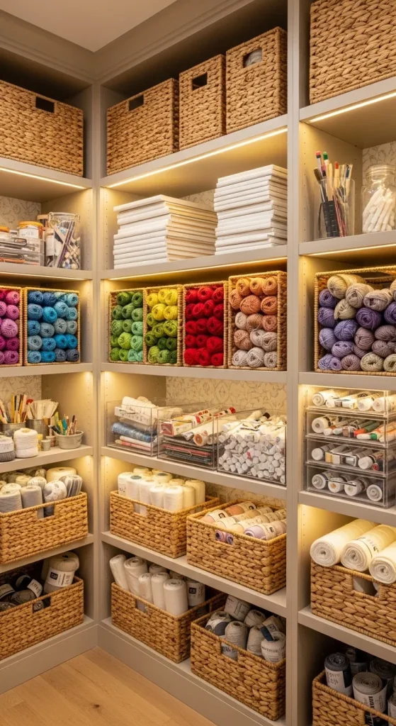 Floating shelves provide an airy and contemporary feel, and when paired with LED accent lighting, they bring a glamorous glow to your craft room closet. Highlight your most beautiful supplies like colorful threads, ribbons, or decorative papers. This setup creates a boutique-like display, making your craft materials feel like works of art themselves.