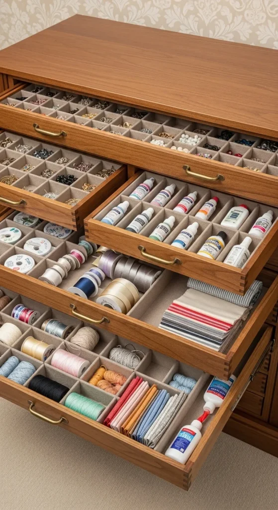 Luxury comes in organization. A closet with customized drawers, dividers, and pull-out trays ensures everything has its place. From small bead compartments to large fabric drawers, this system keeps your workspace neat while maintaining a high-end feel. Opt for rich wood finishes or high-gloss lacquered surfaces to elevate the aesthetic.