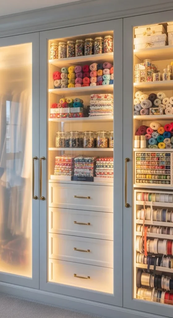 Imagine a craft room closet with sleek glass doors, allowing a glimpse of neatly arranged supplies inside. This design combines sophistication and practicality, turning your storage into a decorative focal point. Use frosted glass for a softer look or clear glass for a bold showcase of vibrant craft materials. Golden or matte black hardware adds a luxurious touch.